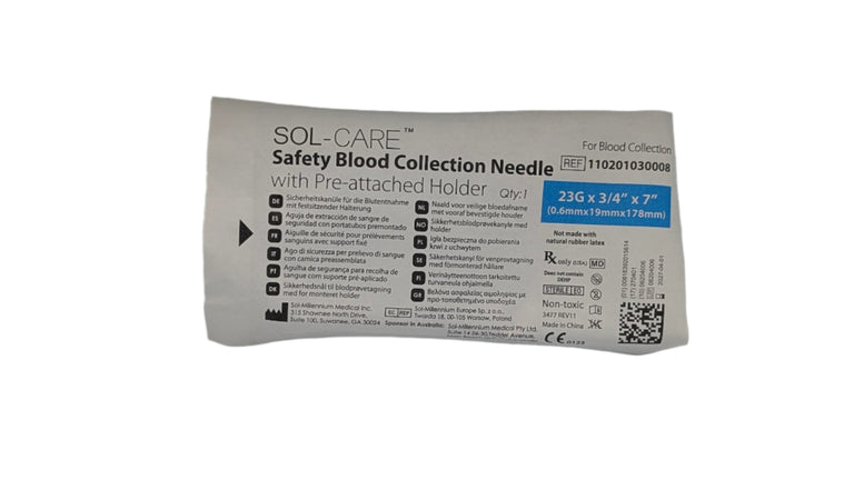 Home / 23G x 0.75" x 7" Tubing Sol-M Safety Blood Collection Needle w/ Pre-Attached Holder