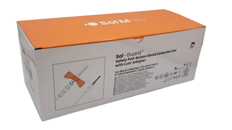 The SOL-GUARD Safety Pull-Button Blood Collection Set is designed for safe, efficient, and precise blood collection. Each box contains 50 sets. Featuring a 25G x 3/4" needle and 12-inch tubing, this set ensures smooth and reliable venous access. Its innovative pull-button safety mechanism helps p...Read More